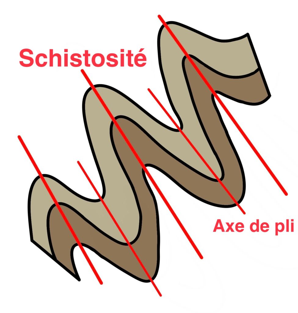 Dans une roche plissée, quand le pli est très marqué, une nouvelle schistosité se met en place parallèlement au plan axial des plis (perpendiculaire au raccourcissement).
