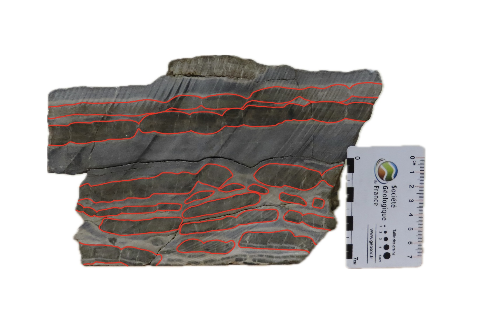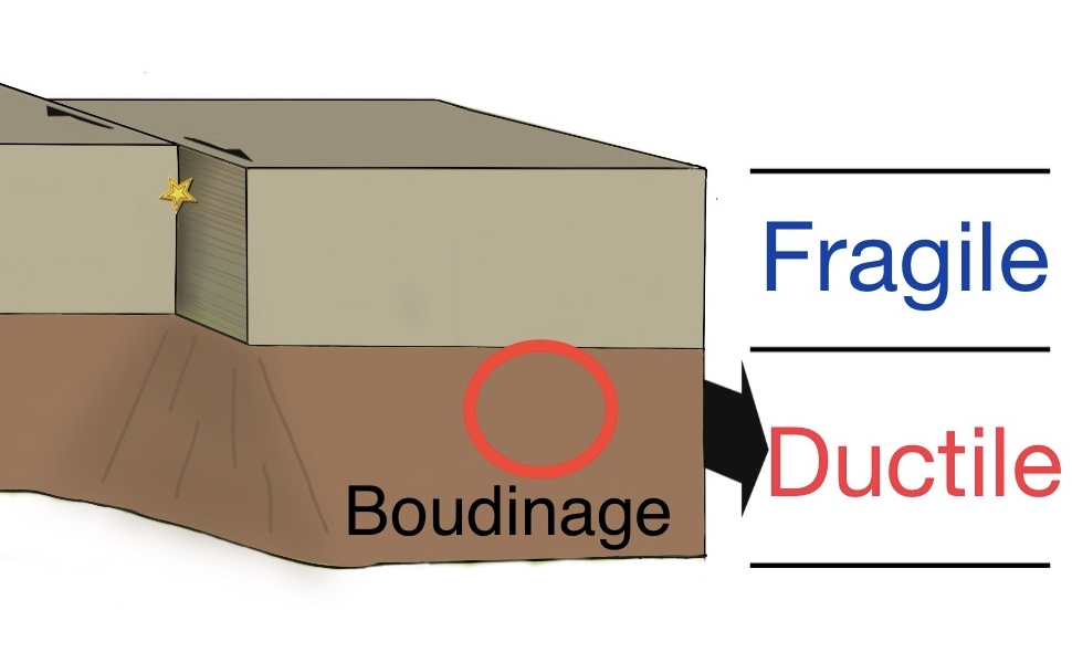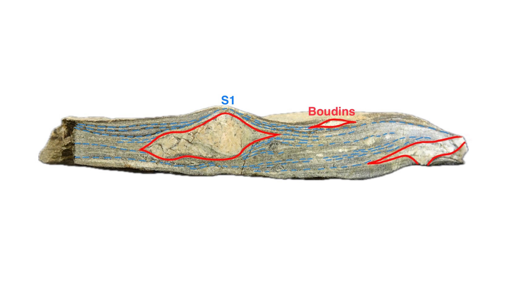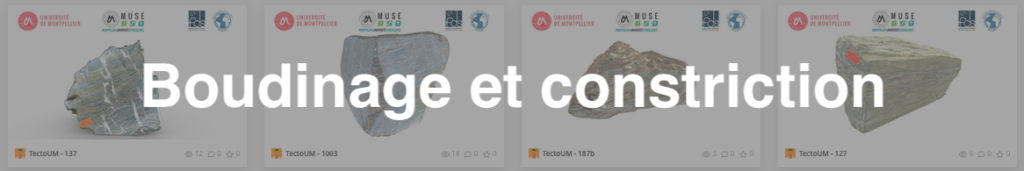 Le boudinage est une structure tectonique ductile formé par allongement/étirement. Cela se forme lorsqu’il y a un contraste de résistance entre niveau compétent et niveau incompétent.